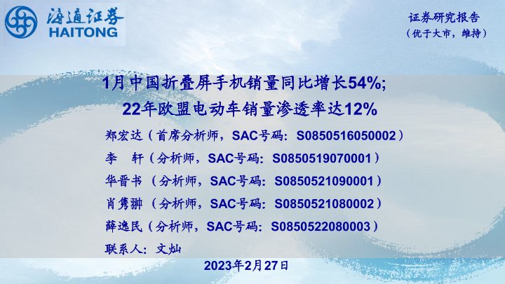 【海通证券】【20230227】20230227-海通证券-电子行业:1月中国折叠屏手机销量同比增长54%;22年欧盟电动车销量渗透率达12%-10页