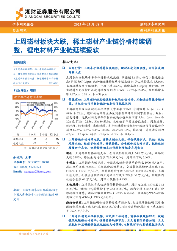 【湘财证券】【20230308】20230308-湘财证券-新材料行业周报:上周磁材板块大跌,稀土磁材产业链价格持续调整,锂电材料产业链延续疲软-14页