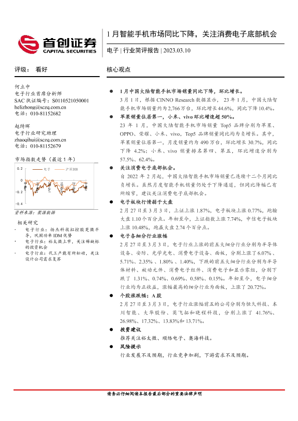 【首创证券】【20230310】20230310-首创证券-电子行业简评报告:1月智能手机市场同比下降,关注消费电子底部机会-11页