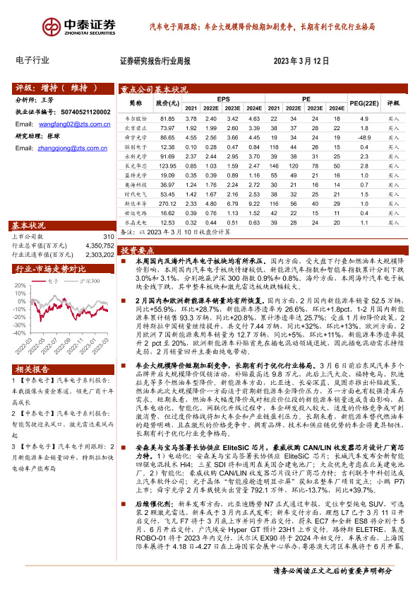 【中泰证券】【20230312】汽车电子周跟踪:车企大规模降价短期加剧竞争,长期有利于优化行业格局-14页