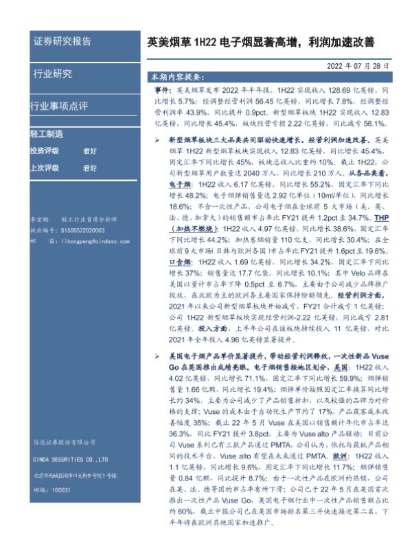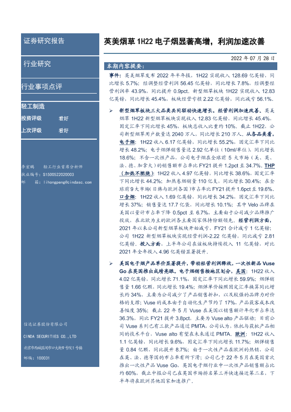 【信达证券】【20220728】英美烟草1H22电子烟显著高增,利润加速改善-4页