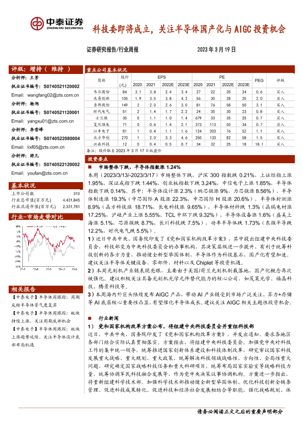 【中泰证券】【20230319】20230319-中泰证券-半导体行业周报:科技委即将成立,关注半导体国产化与AIGC投资机会-15页