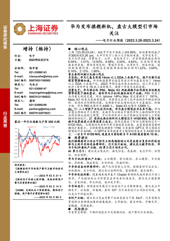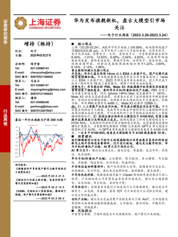 【上海证券】【20230327】电子行业周报:华为发布旗舰新机,盘古大模型引市场关注-11页