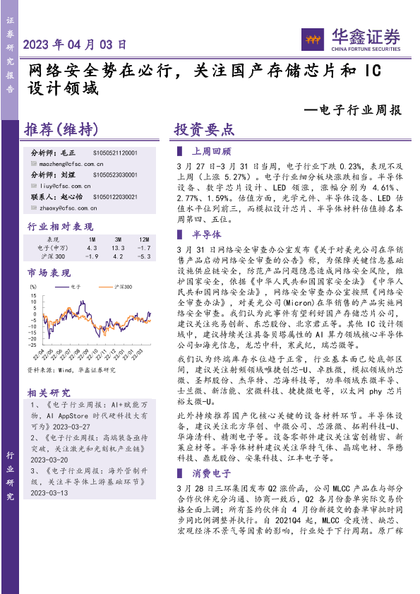 【华鑫证券】【20230403】20230403-华鑫证券-电子行业周报:网络安全势在必行,关注国产存储芯片和IC设计领域-49页