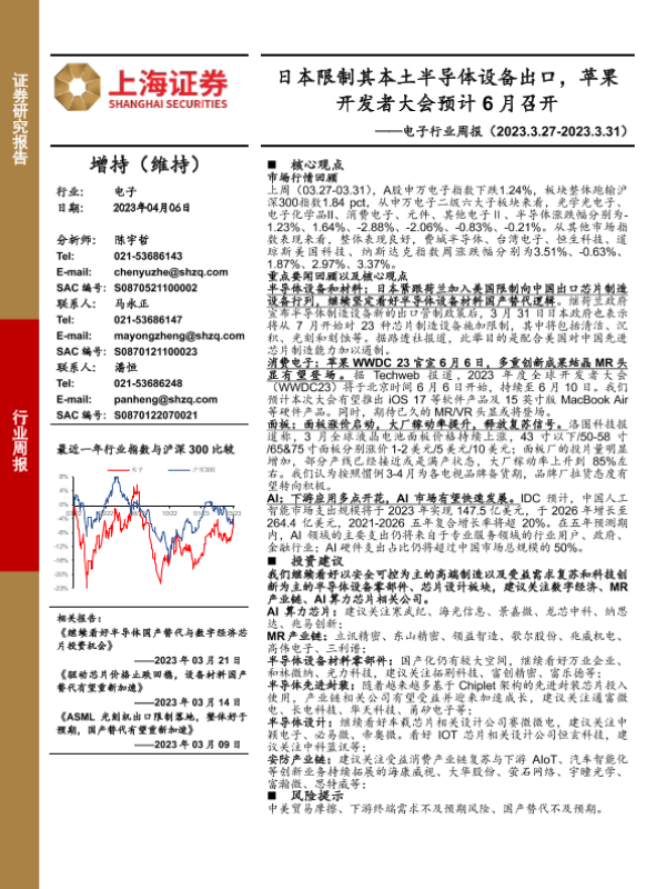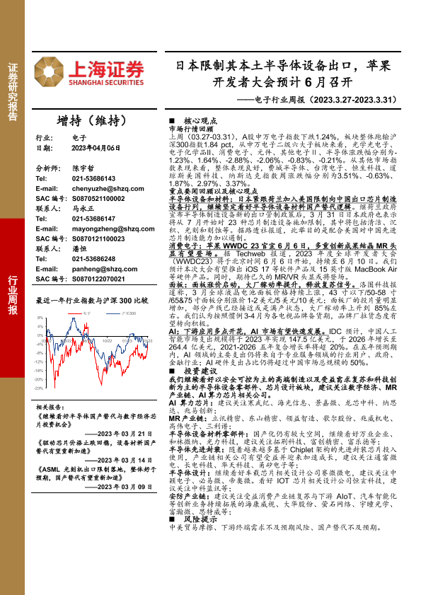【上海证券】【20230406】电子行业周报:日本限制其本土半导体设备出口,苹果开发者大会预计6月召开-13页