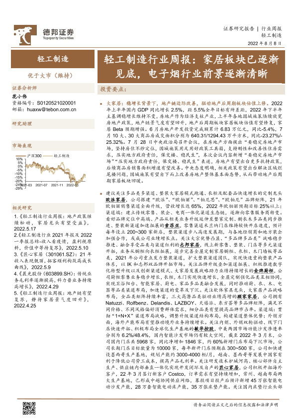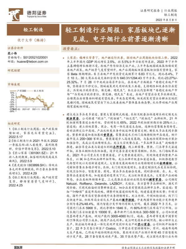 【德邦证券】【20220808】轻工制造行业周报:家居板块已逐渐见底,电子烟行业前景逐渐清晰-20页