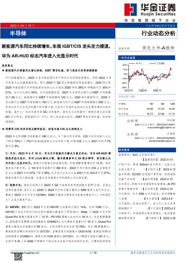 【华金证券】【20230416】半导体行业动态分析:新能源汽车同比持续增长,车规IGBT CIS龙头发力提速,华为AR-HUD标志汽车进入光显示时代-16页