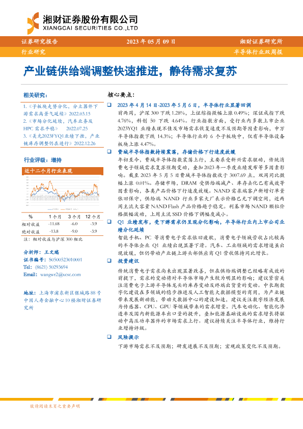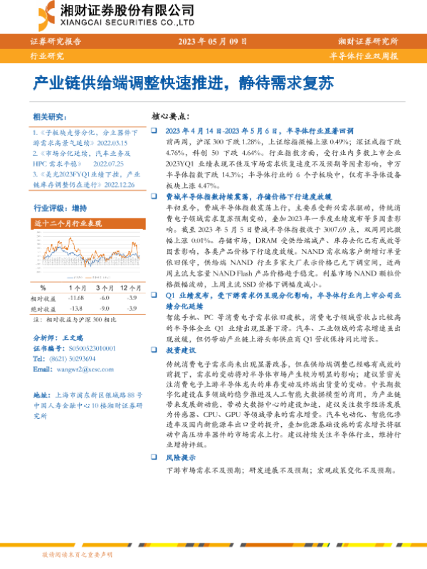 【湘财证券】【20230509】20230509-湘财证券-半导体行业双周报:产业链供给端调整快速推进,静待需求复苏-12页