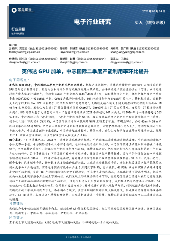 【国金证券】【20230514】电子行业研究:英伟达GPU加单,中芯国际二季度产能利用率环比提升-14页