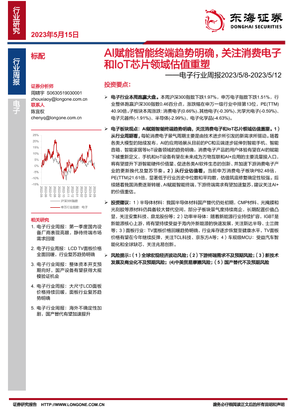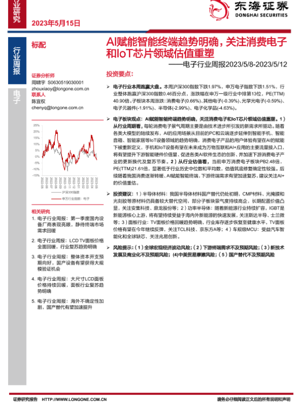 【东海证券】【20230515】AI赋能智能终端趋势明确,关注消费电子和IoT芯片领域估值重塑——电子行业周报2023/5/8-2023/5/12-13页