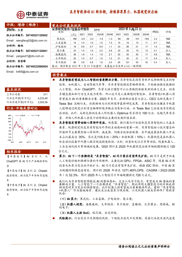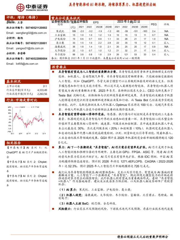【中泰证券】【20230522】电子行业:具身智能推动AI新浪潮,持续推荐算力、机器视觉供应链-13页