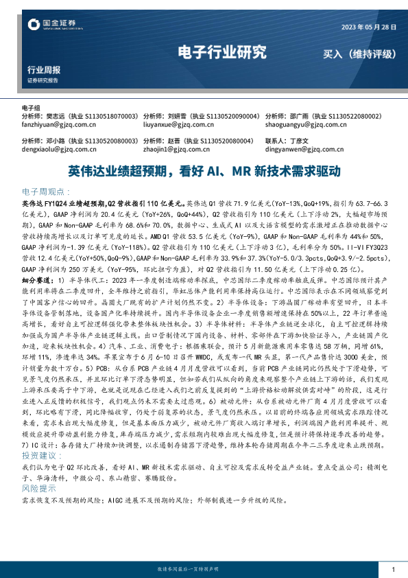 【国金证券】【20230528】20230528-国金证券-电子行业周报:英伟达业绩超预期,看好AI、MR新技术需求驱动-13页