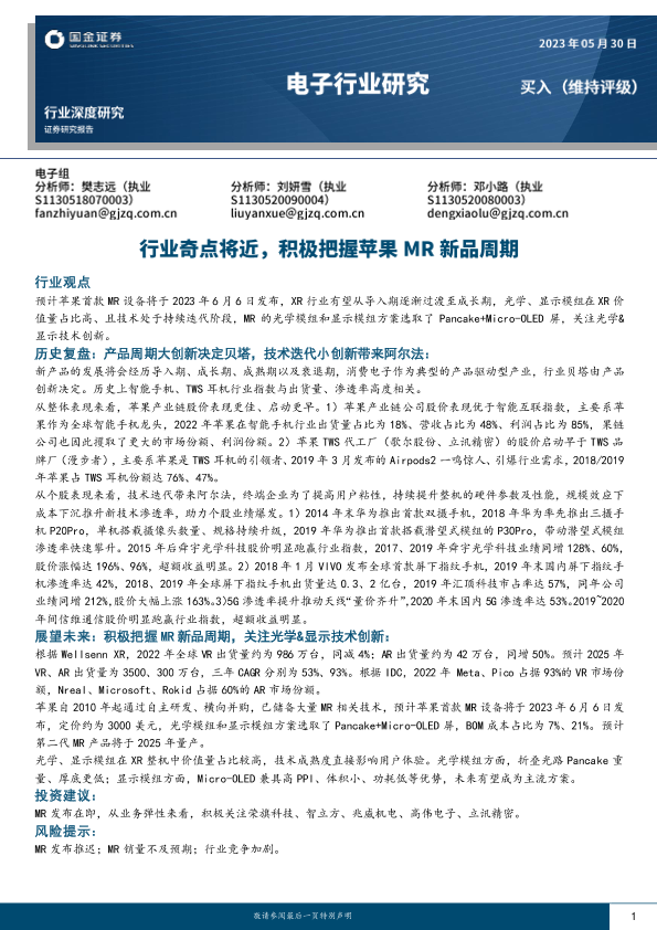 【国金证券】【20230530】20230530-国金证券-电子行业深度研究:行业奇点将近,积极把握苹果MR新品周期-17页