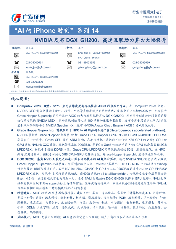 【广发证券】【20230601】“AI的iPhone时刻”系列14:NVIDIA发布DGX GH200,高速互联助力算力大幅提升-10页