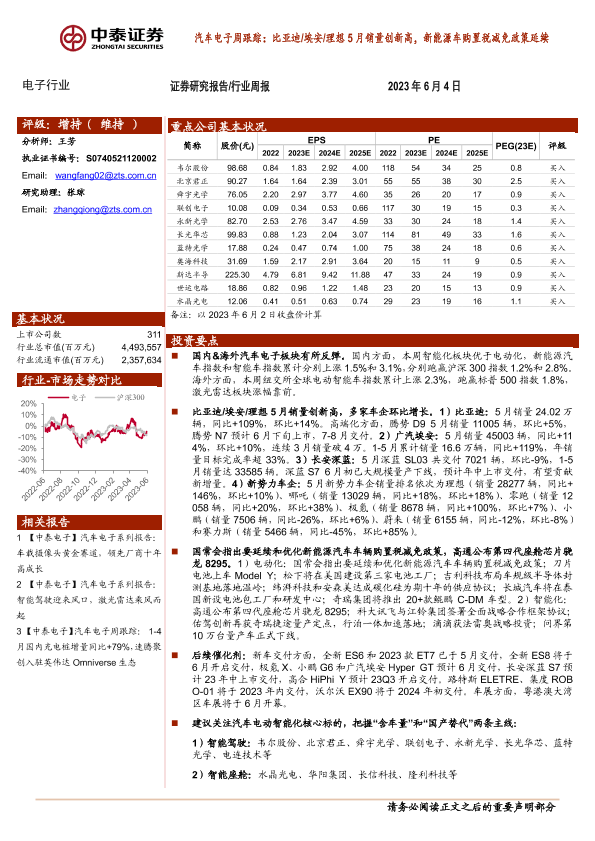 【中泰证券】【20230604】汽车电子周跟踪:比亚迪 埃安 理想5月销量创新高,新能源车购置税减免政策延续-16页