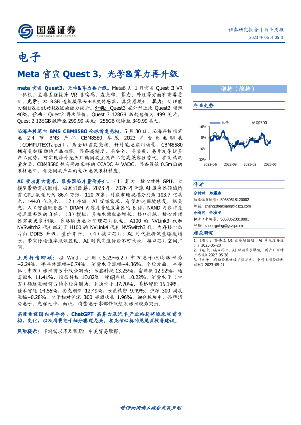 【国盛证券】【20230605】电子行业周报:Meta官宣Quest 3,光学&算力再升级-15页