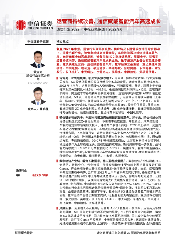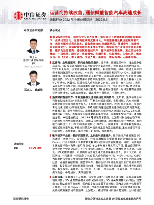 【中信证券】【20220906】通信行业2022年中报业绩综述:运营商持续改善,通信赋能智能汽车高速成长-31页