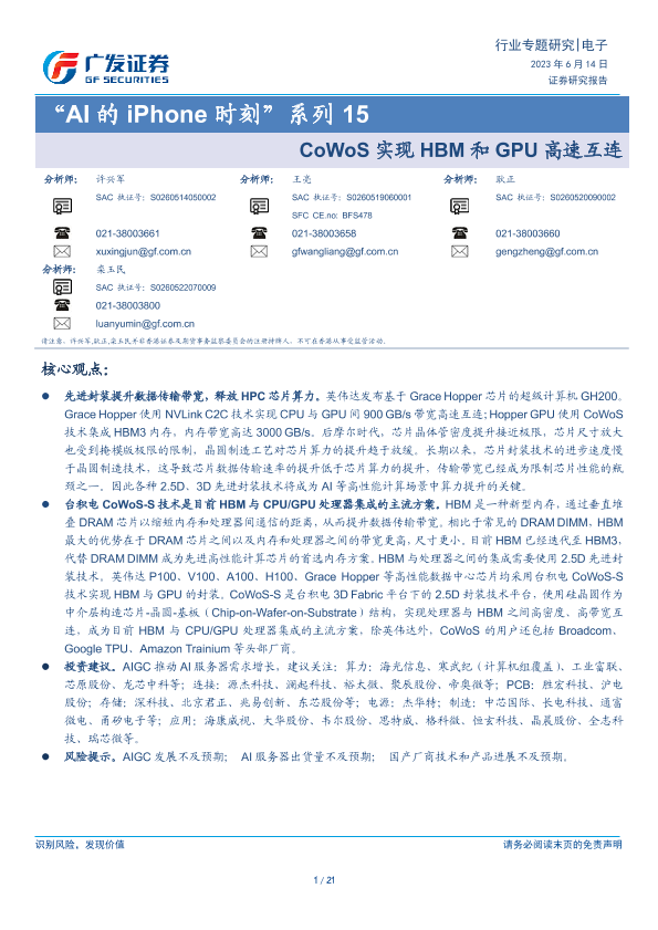 【广发证券】【20230614】“AI的iPhone时刻”系列15-CoWoS实现HBM和GPU高速互连-21页
