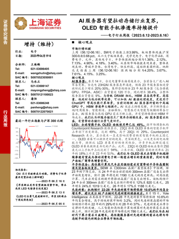【上海证券】【20230619】20230619-上海证券-电子行业周报:AI服务器有望拉动存储行业复苏,OLED智能手机渗透率持续提升-12页