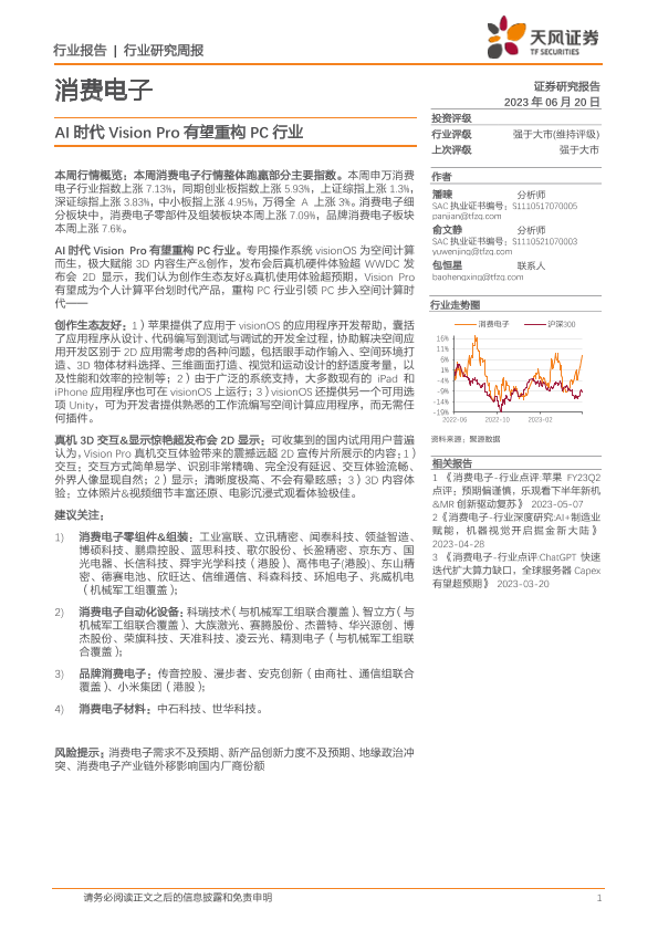 【天风证券】【20230620】消费电子行业研究周报:AI时代Vision Pro有望重构PC行业-15页