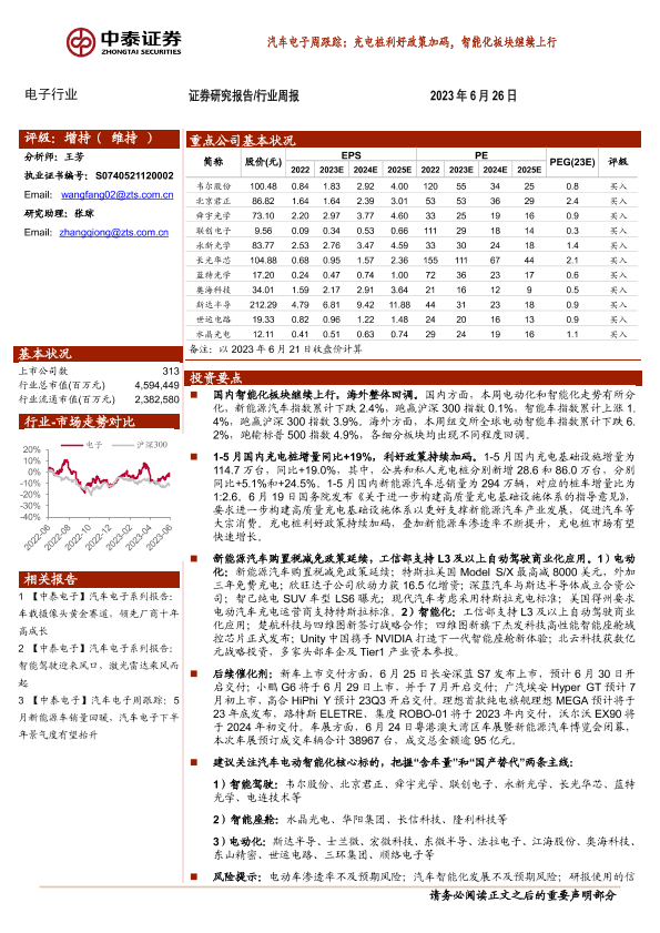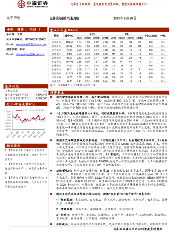 【中泰证券】【20230626】汽车电子周跟踪:充电桩利好政策加码,智能化板块继续上行-13页