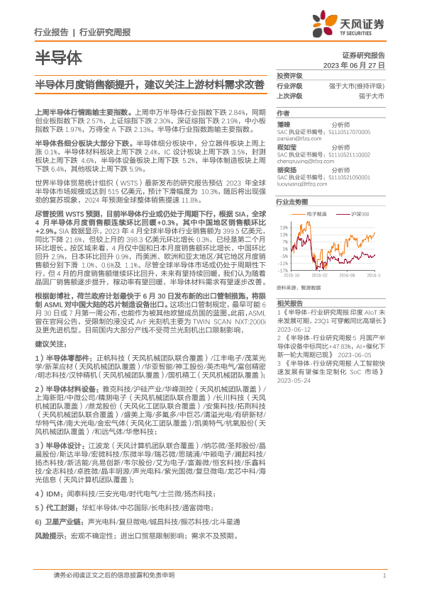 【天风证券】【20230627】20230627-天风证券-半导体行业研究周报:半导体月度销售额提升,建议关注上游材料需求改善-11页
