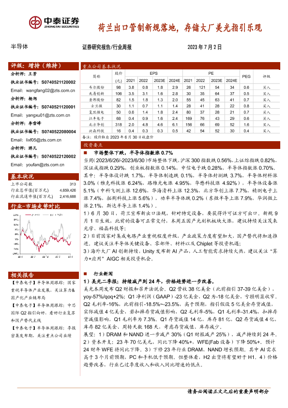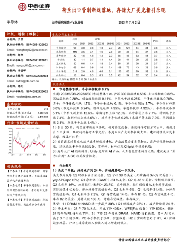 【中泰证券】【20230702】20230702-中泰证券-半导体行业周报:荷兰出口管制新规落地,存储大厂美光指引乐观-14页