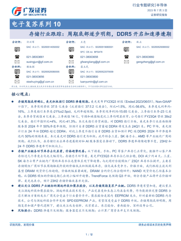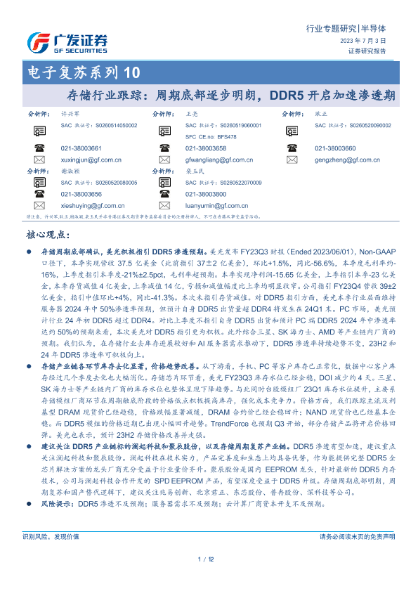 【广发证券】【20230703】存储行业跟踪:周期底部逐步明朗,DDR5开启加速渗透期-12页