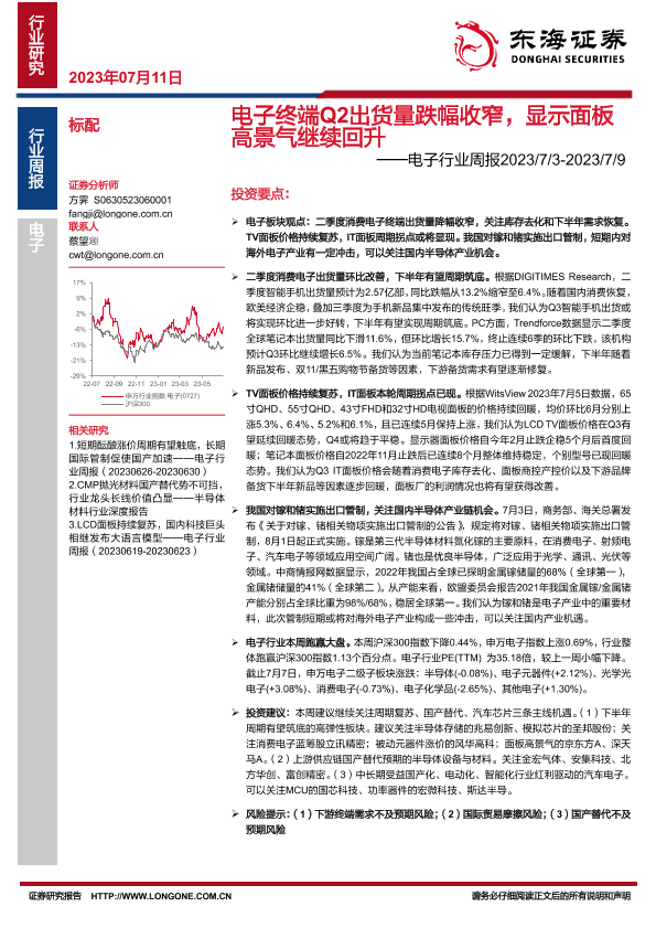 【东海证券】【20230711】电子终端Q2出货量跌幅收窄,显示面板高景气继续回升-18页