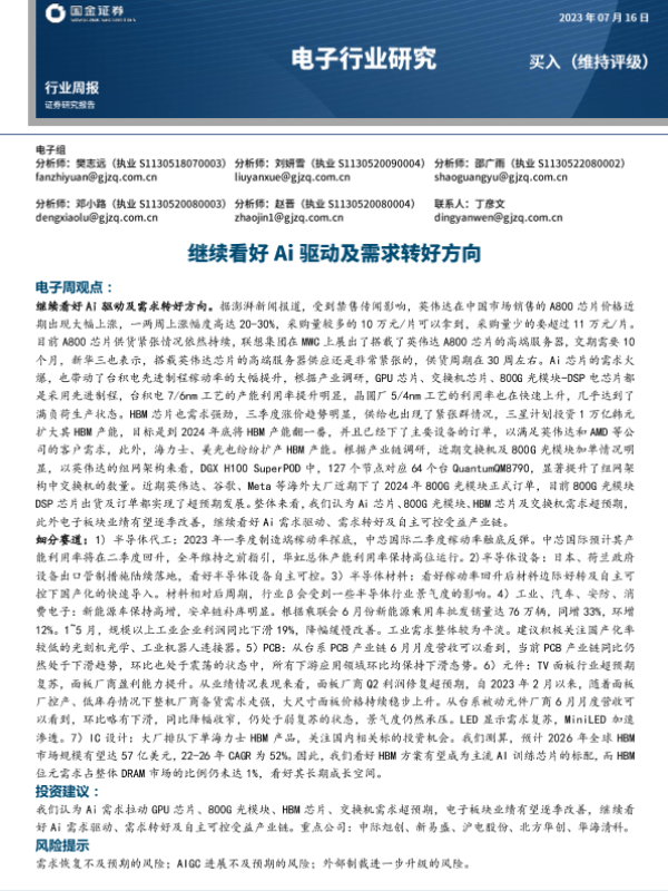 【国金证券】【20230716】20230716-国金证券-电子行业研究:继续看好Ai驱动及需求转好方向-15页