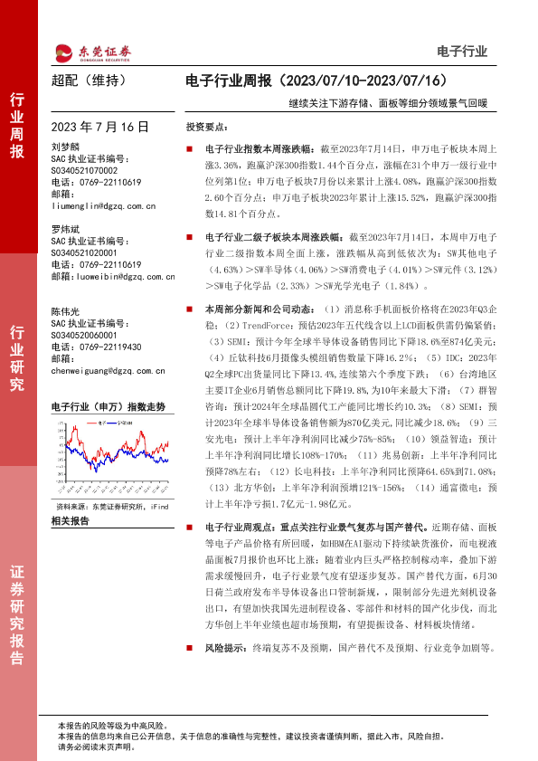 【东莞证券】【20230716】电子行业周报:继续关注下游存储、面板等细分领域景气回暖-12页