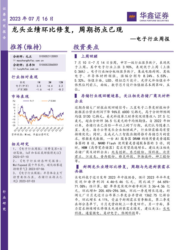【华鑫证券】【20230716】电子行业周报:龙头业绩环比修复,周期拐点已现-44页