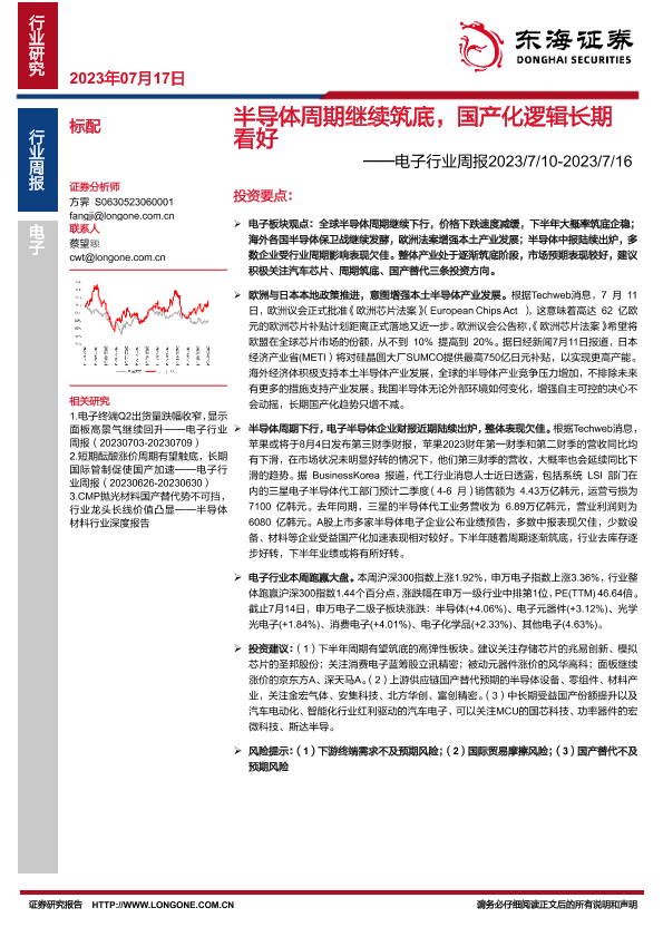 【东海证券】【20230717】20230717-东海证券-电子行业周报:半导体周期继续筑底,国产化逻辑长期看好-19页