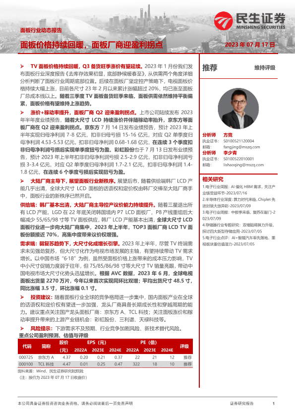 【民生证券】【20230717】面板行业动态报告:面板价格持续回暖,面板厂商迎盈利拐点-12页