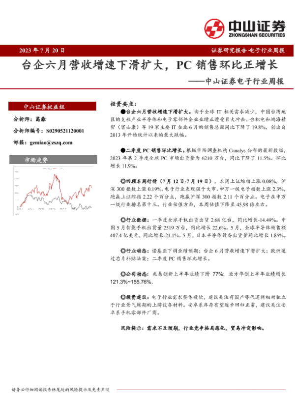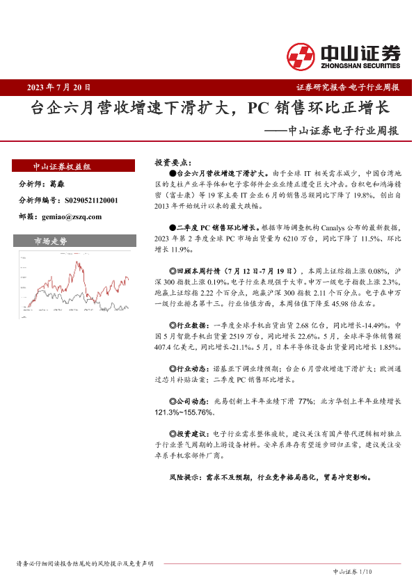 【中山证券】【20230720】20230720-中山证券-电子行业周报:台企六月营收增速下滑扩大,PC销售环比正增长-10页