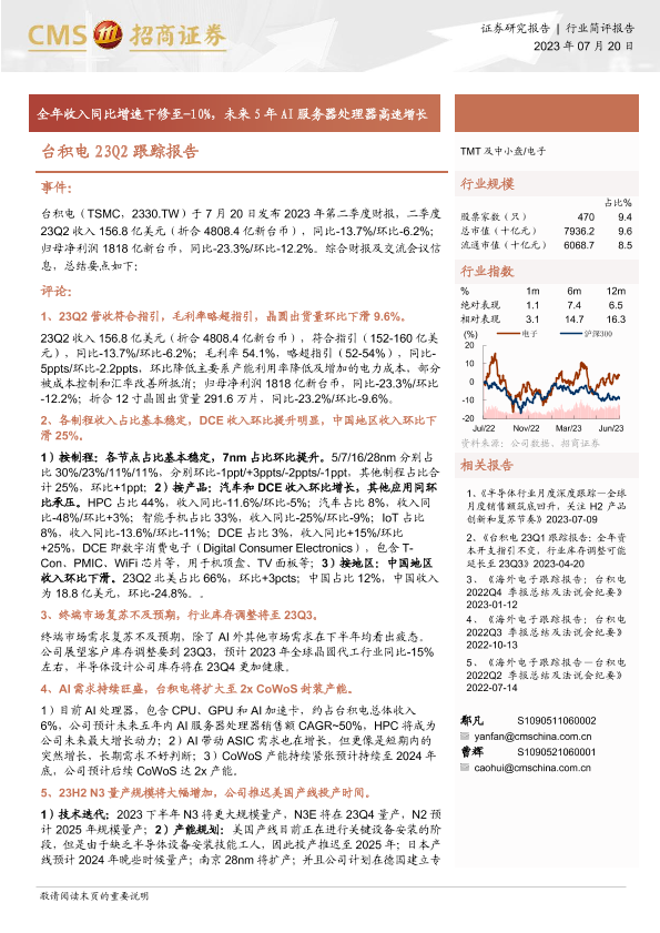 【海通证券】【20230720】台积电23Q2跟踪报告:全年收入同比增速下修至-10%,未来5年AI服务器处理器高速增长-12页