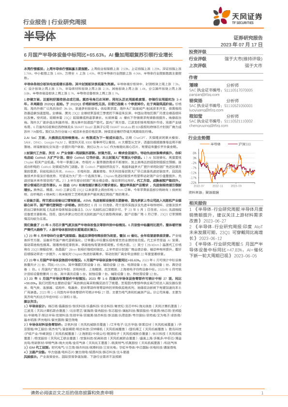 【天风证券】【20230718】20230718-天风证券-半导体行业研究周报:6月国产半导体设备中标同比+65.63%,AI叠加周期复苏引领行业增长-27页