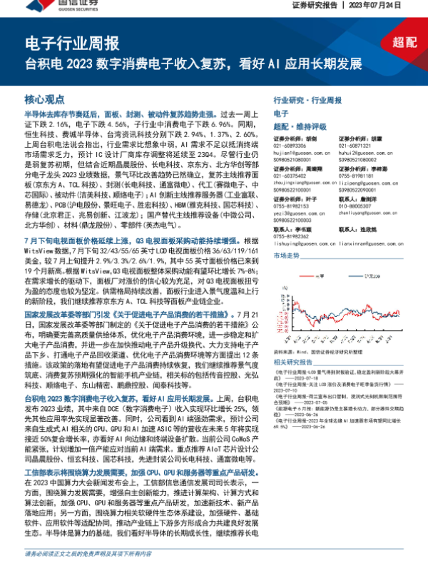 【国信证券】【20230724】电子行业周报:台积电2Q23数字消费电子收入复苏,看好AI应用长期发展-14页