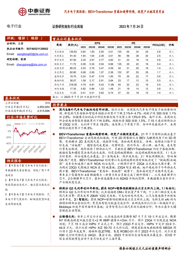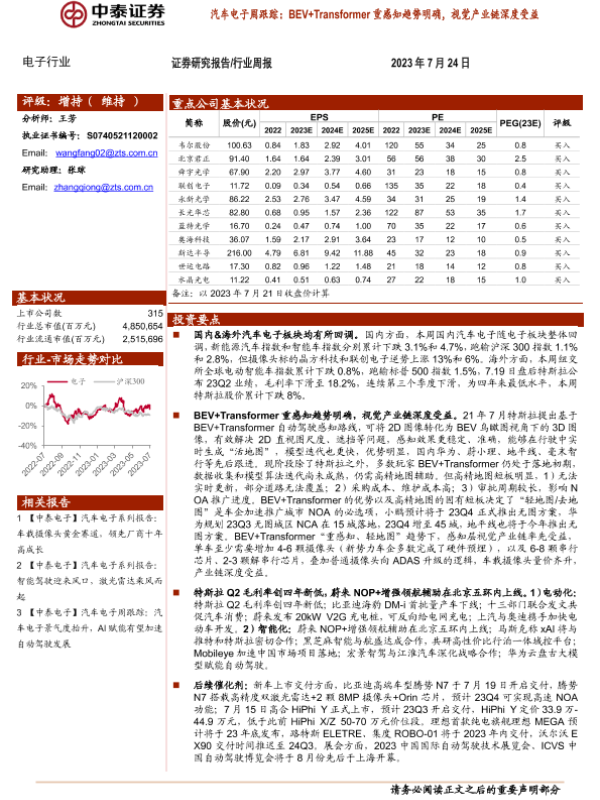 【中泰证券】【20230724】汽车电子周跟踪:BEV+Transformer重感知趋势明确,视觉产业链深度受益-14页