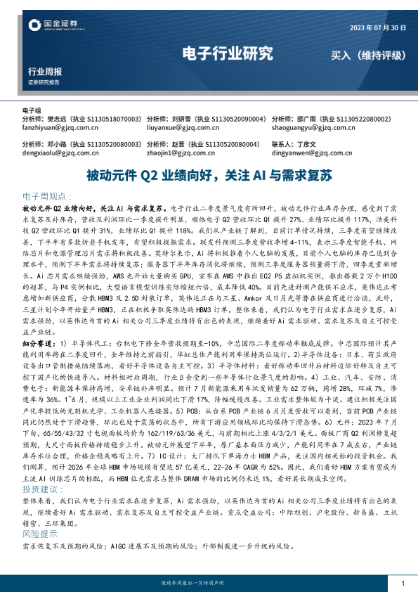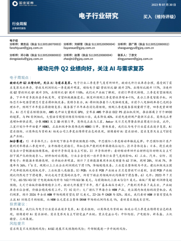 【国金证券】【20230730】20230730-国金证券-电子行业研究:被动元件Q2业绩向好,关注AI与需求复苏-15页