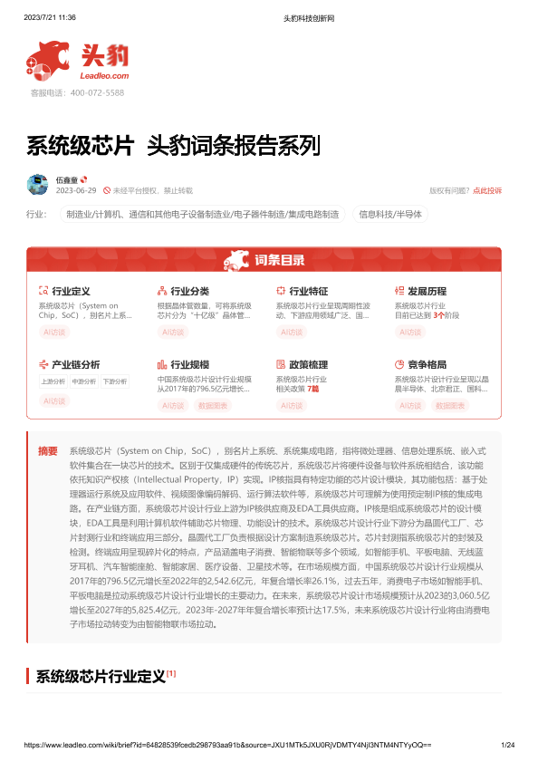 【头豹研究院】【20230721】系统级芯片 头豹词条报告系列-24页