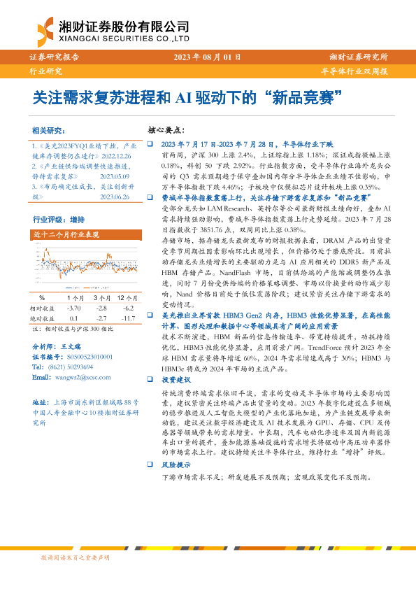 【湘财证券】【20230801】20230801-湘财证券-半导体行业双周报:关注需求复苏进程和AI驱动下的“新品竞赛”-11页