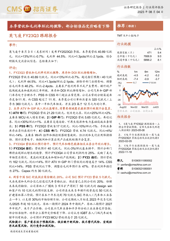【海通证券】【20230804】英飞凌FY23Q3跟踪报告-本季营收和毛利率环比均微降,部分标准品定价略有下降-14页
