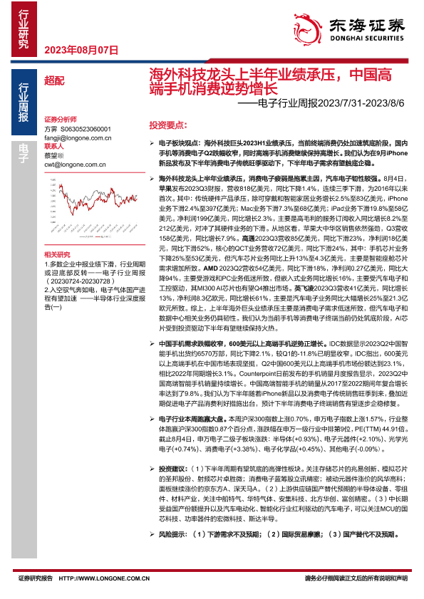 【东海证券】【20230807】20230806-东海证券-电子行业周报:海外科技龙头上半年业绩承压,中国高端手机消费逆势增长-20页