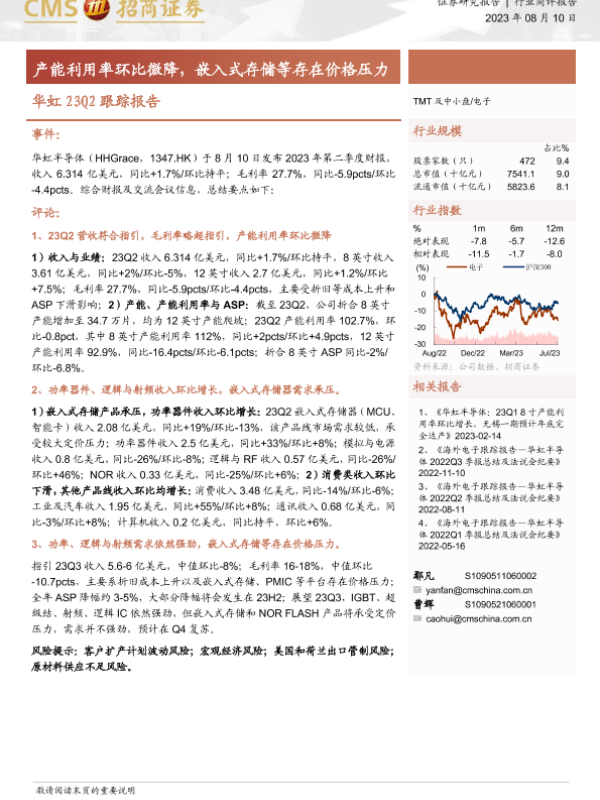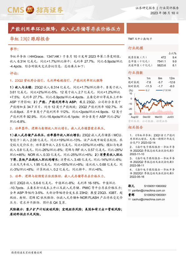 【海通证券】【20230810】华虹23Q2跟踪报告-产能利用率环比微降,嵌入式存储等存在价格压力-12页