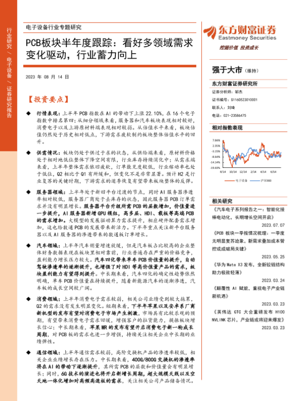【东方财富证券】【20230814】电子设备行业专题研究:PCB板块半年度跟踪:看好多领域需求变化驱动,行业蓄力向上-21页