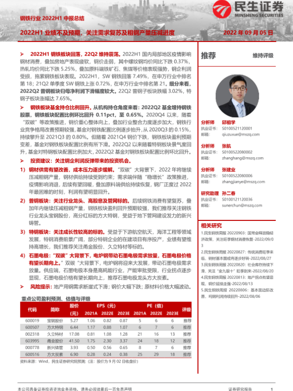 【民生证券】【20220905】钢铁行业2022H1中报总结:2022H1业绩不及预期,关注需求复苏及粗钢产量压减进度-23页