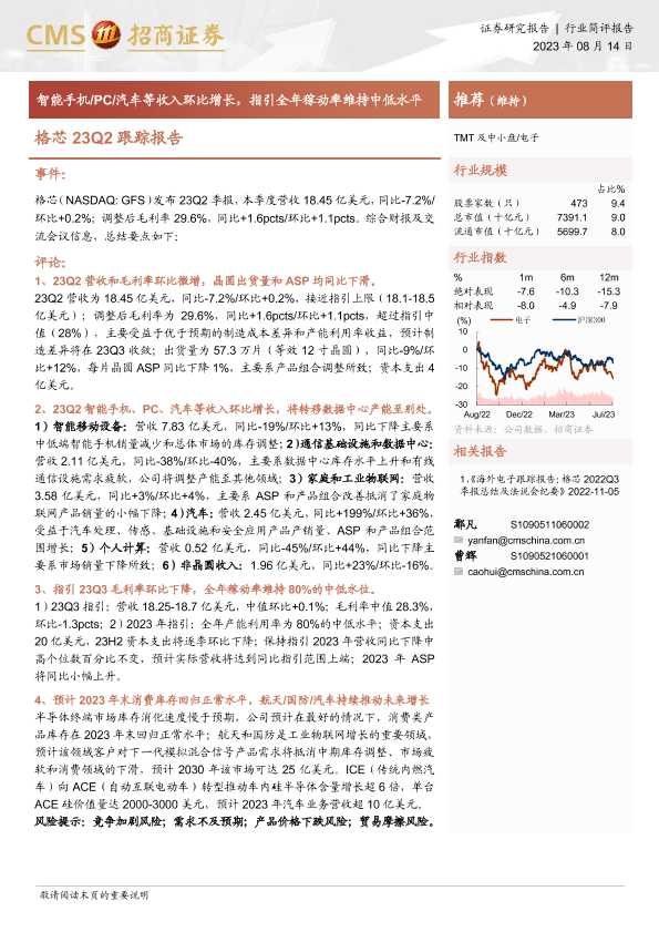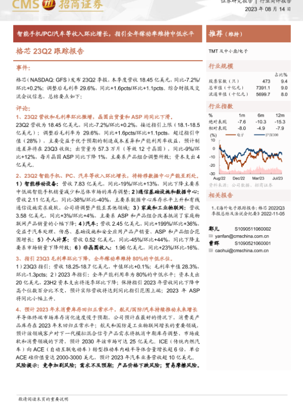 【海通证券】【20230814】20230814-招商证券-电子:格芯23Q2跟踪报告-智能手机 PC 汽车等收入环比增长,指引全年稼动率维持中低水平-11页