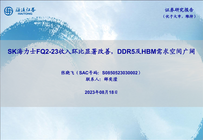 【海通证券】【20230818】SK海力士FQ2-23收入环比显著改善,DDR5及HBM需求空间广阔-20页