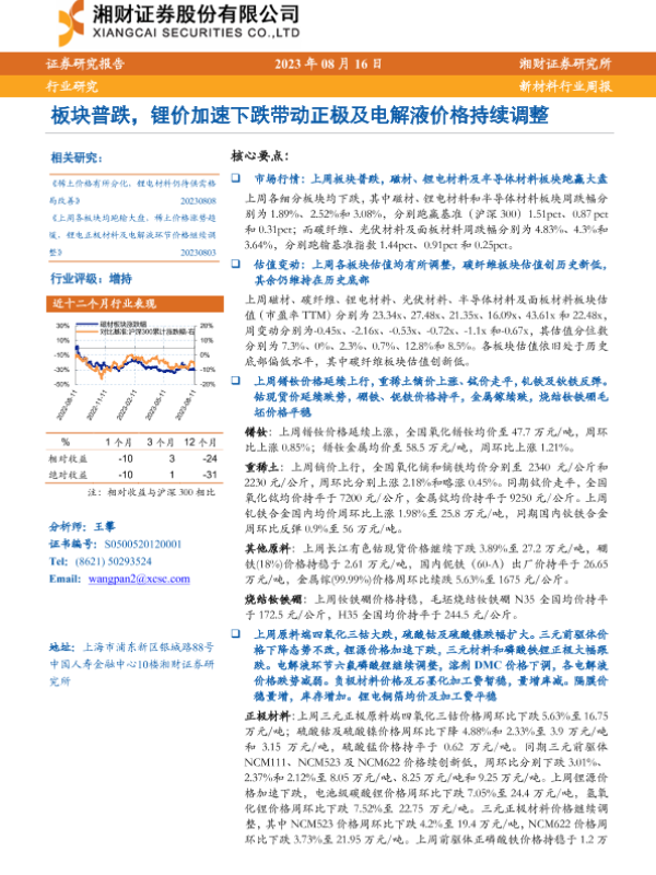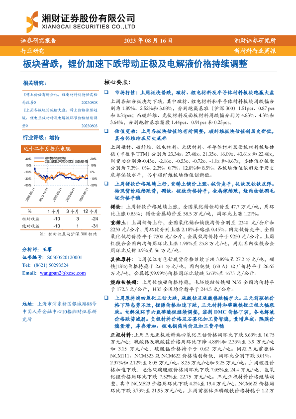 【湘财证券】【20230816】20230816-湘财证券-新材料行业周报:板块普跌,锂价加速下跌带动正极及电解液价格持续调整-12页